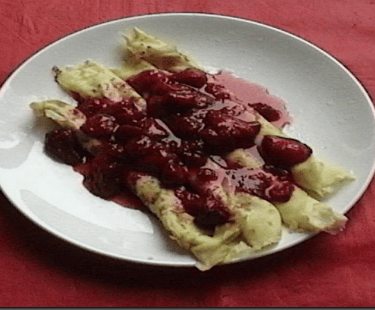 All-You-Can-Eat Pancakes (thin, rolled, delicious) with strawberries, syrup, ham, orange juice, coffee, tea and hot chocolate